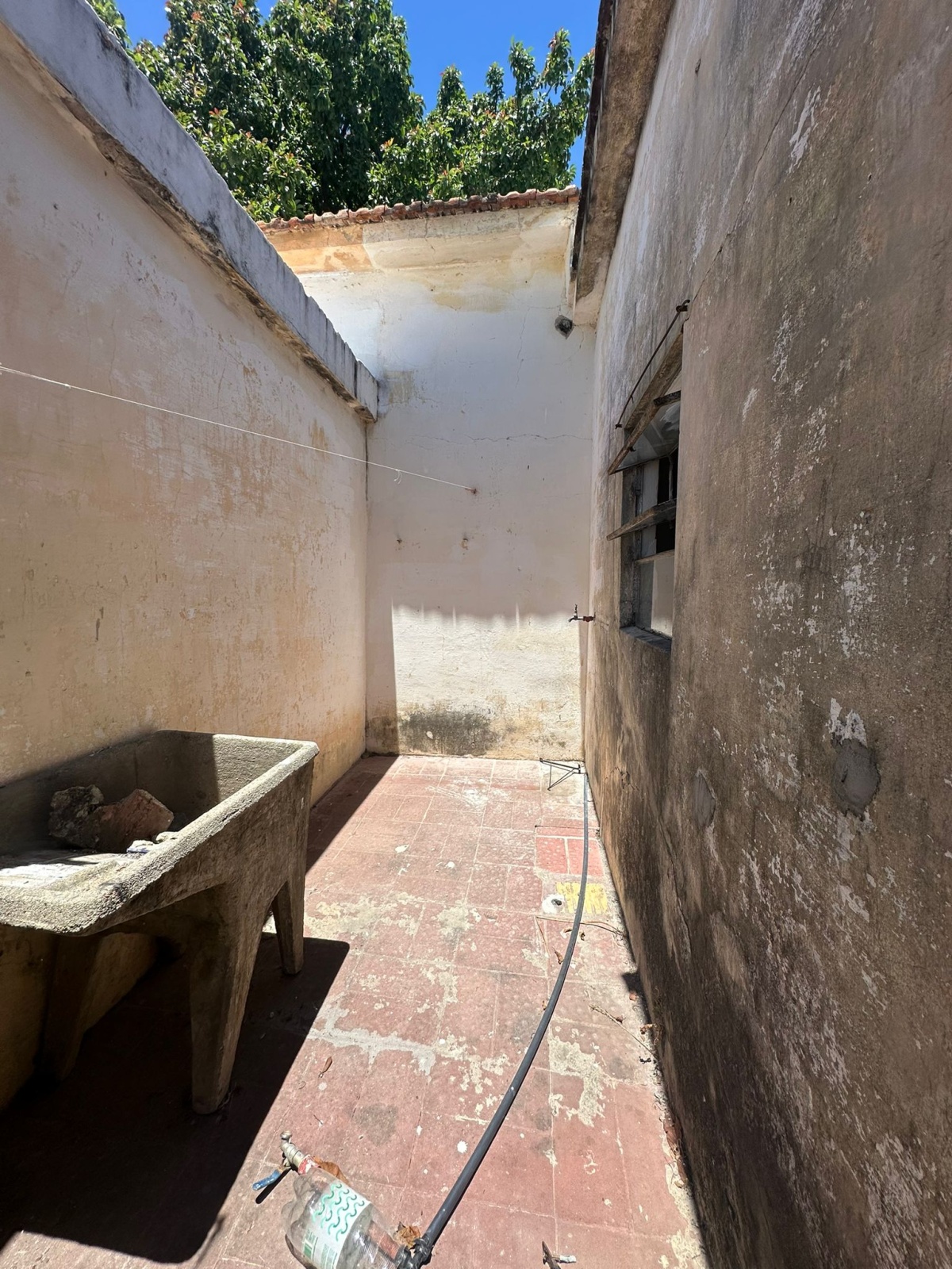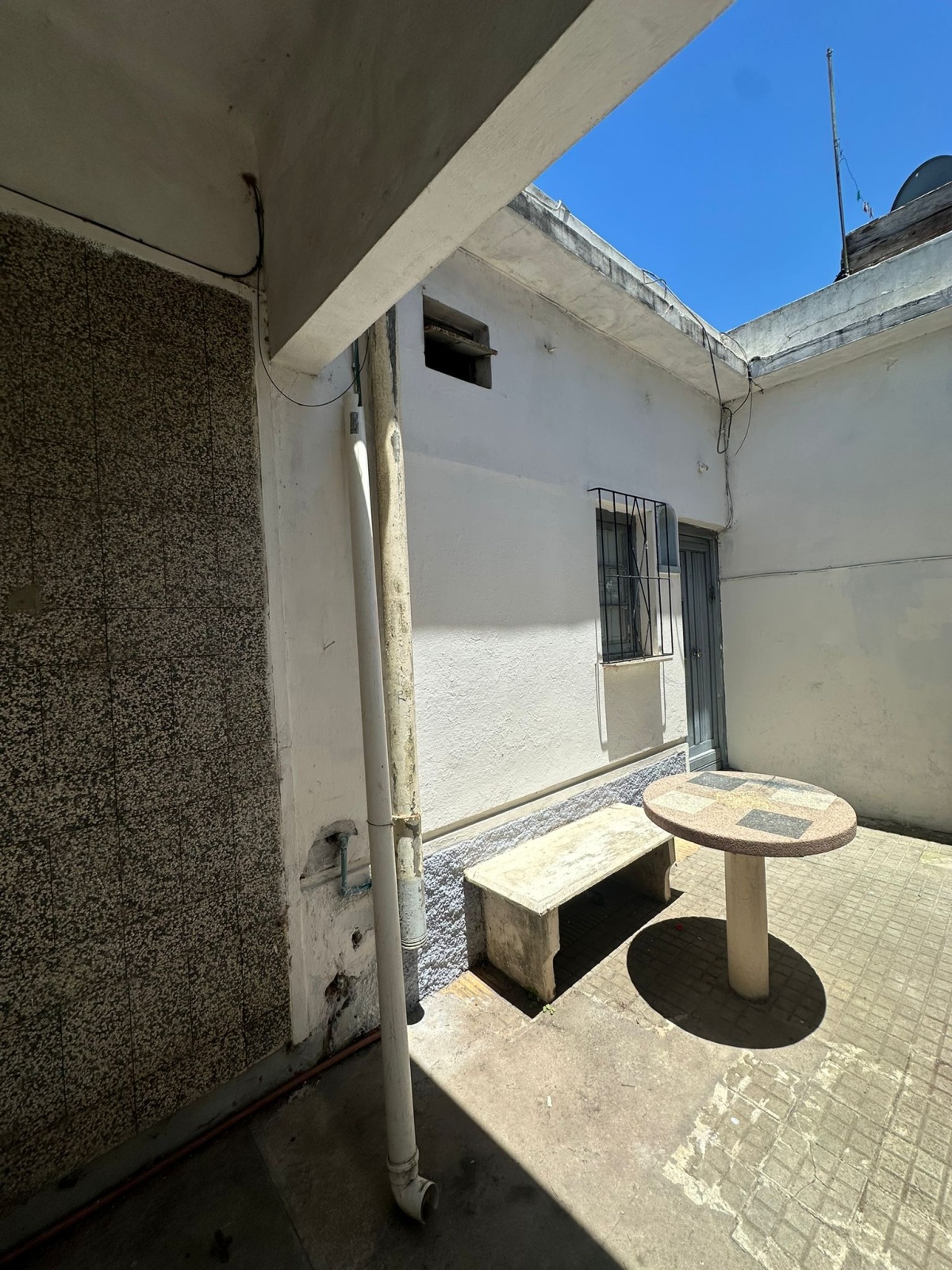 Entrada al predio compartido, puerta de entrada a patio delantero exclusivo con mesa, living, cocina con bajo mesada, 2 dormitorios con ventanas, 2 patios chicos (uno para lavadero y el otro con parrillero).